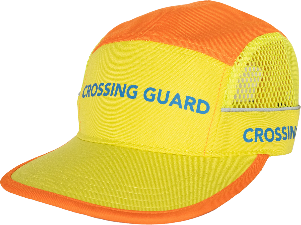 6 panel polyester workwear cap featuring reflective piping, sandwich mesh, and contrast orange trim.
